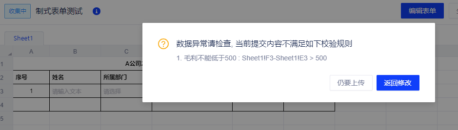 (4)如果用户在表单提交时触发了校验规则,则会对填报者进行提示。用户可以选择返回修改数据,也可以选择继续上传