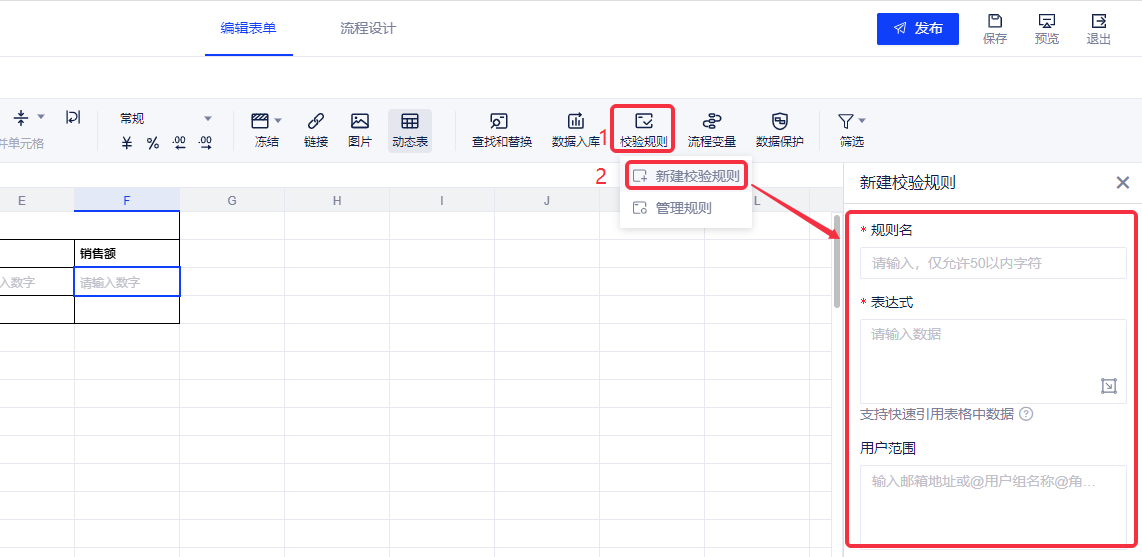 (1)在表单编辑页面,点击[校验规则-新建校验规则],即可在右侧边栏中自行配置规则名和规则表达式
