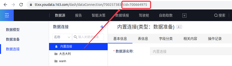 dataConnectionId: 内置连接ID database: 线上模式数据准备ID tableName: 线上模式输出节点ID
