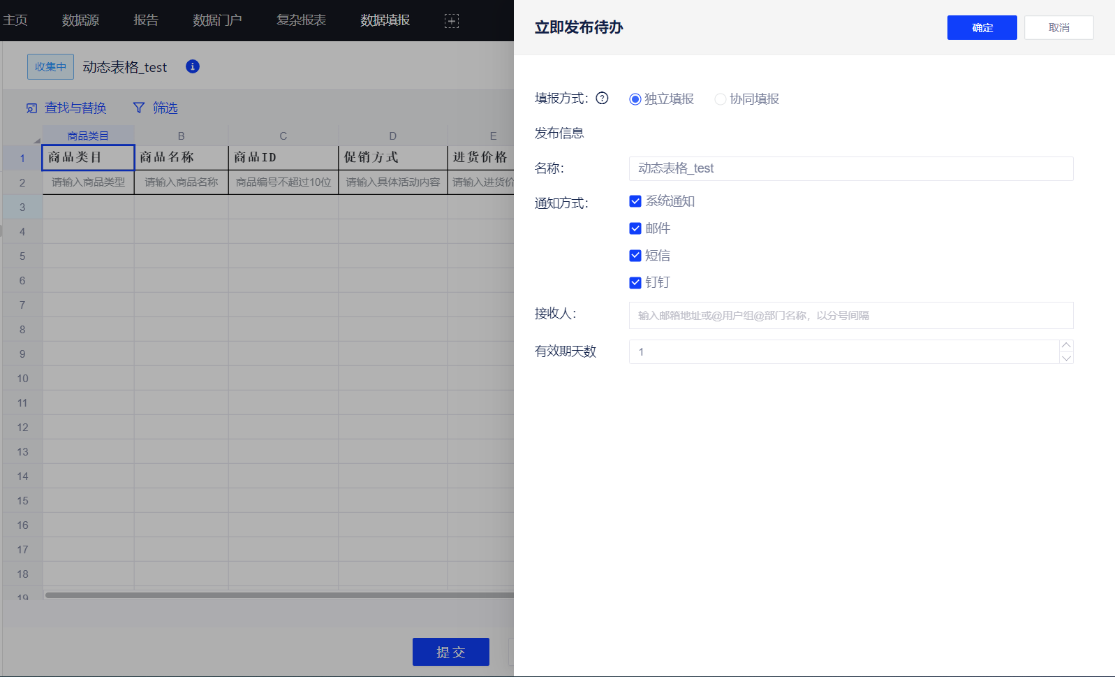 本产品支持发布待办,通过该功能可以通知填写人,但填写人必须是本项目内的用户。待办生成方式分为定时待办和立即待办两种,同时支持独立填报和协同填报两种模式。