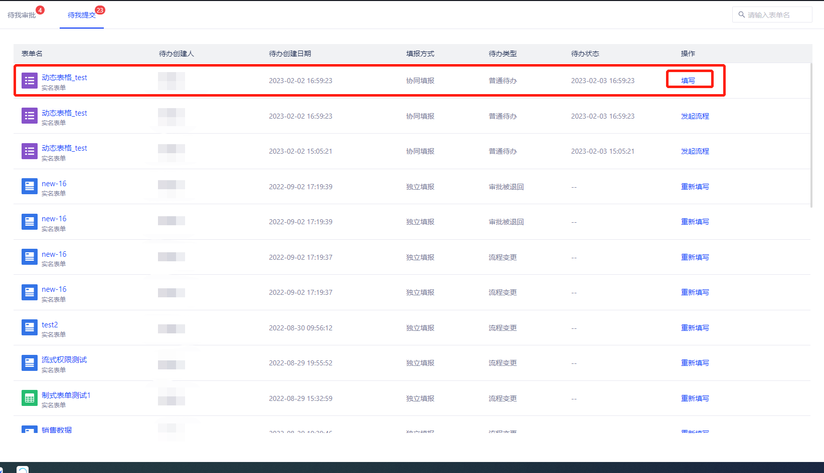 当填报方式为协同填报时,可选择多组填写人和发起人。填写人需要填写表格,而发起人会收到待发起的待办