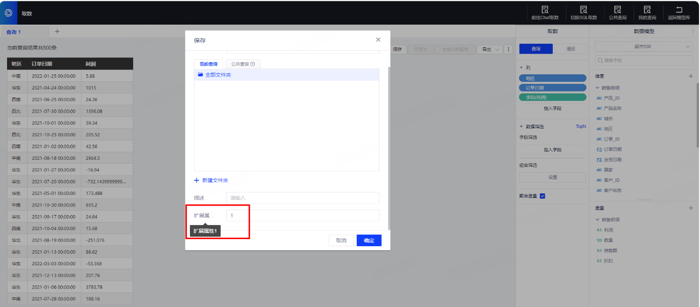 - 应用到取数。保存查询窗口界面中可以查看扩展属性并可编辑修改。