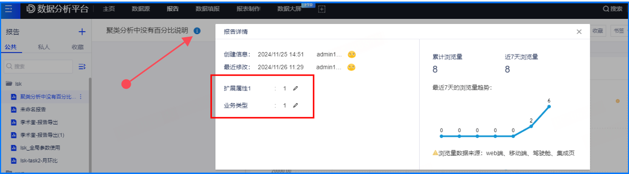 - 应用到报告。点击当前项目中任意报告详情信息,可以看到报告包含扩展属性信息,本例中设置为扩展属性1值为1,业务类型为1。对报告有编辑权限的用户可以在此编辑修改扩展属性。