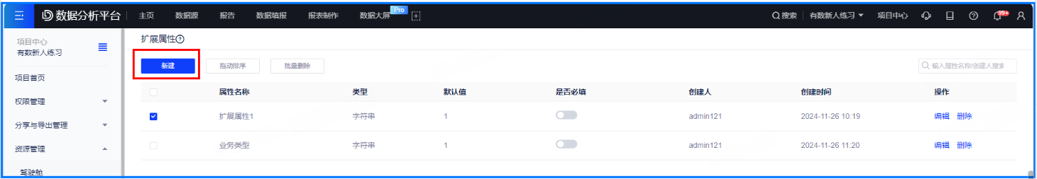 (1)在[项目中心-资源管理-扩展属性],您可以查看当前项目已有的扩展属性并对其进行编辑与删除的操作。您可在扩展属性管理页面完成创建新扩展属性,如下图所示: