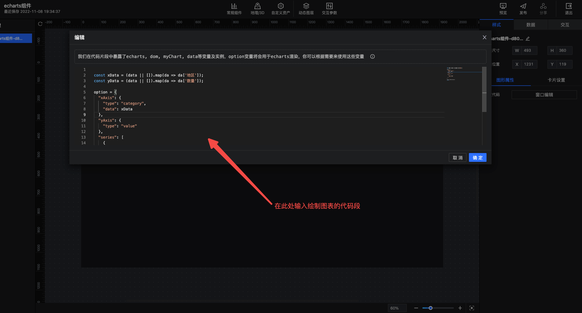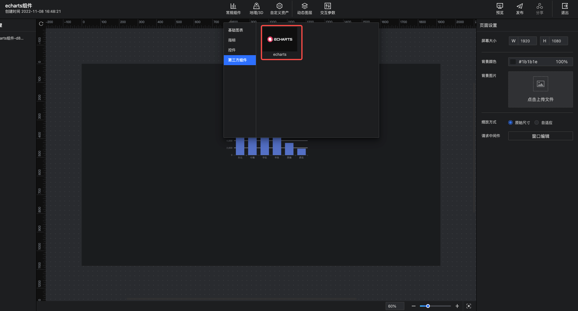 数据大屏,目前第三方组件支持echarts组件,支持绘制各类echarts图表。本文将介绍echarts组件的使用方式(大屏echarts组件跟BI模块里的JavaScript组件使用方式也比较类似)。