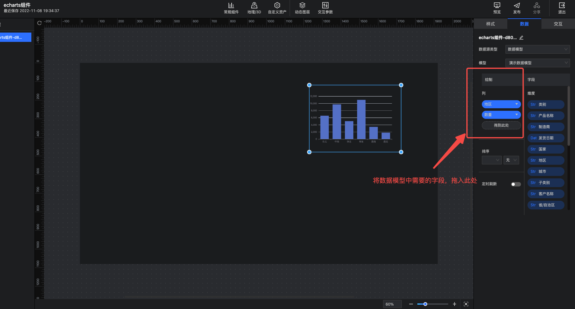 如下图所示,在echarts组件的数据面板,将需要的字段拖入组件的配置区。(图中以“数据模型”数据源为例,你也可以使用静态数据或者API)