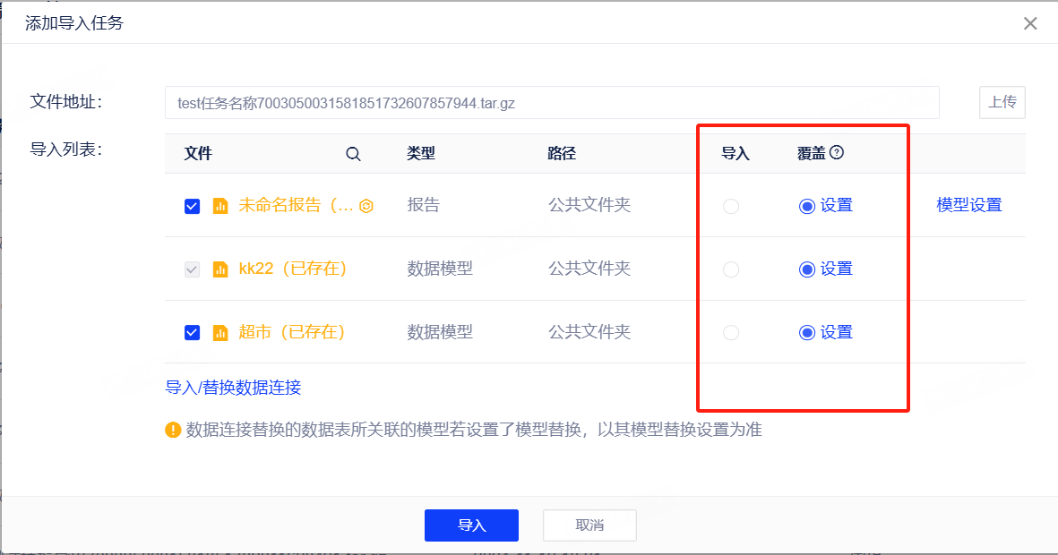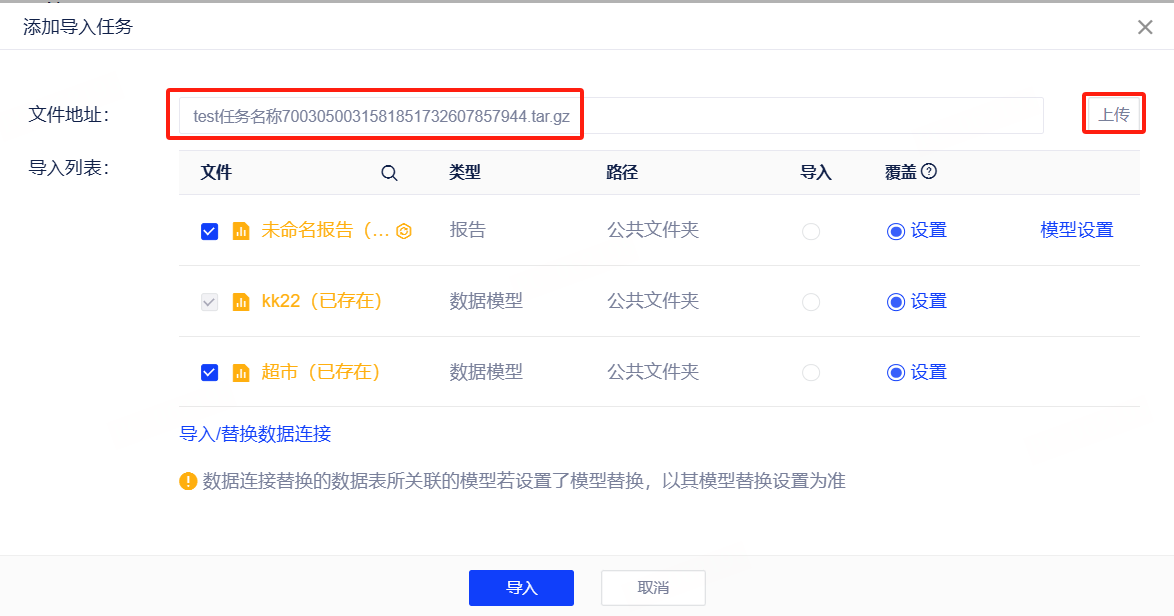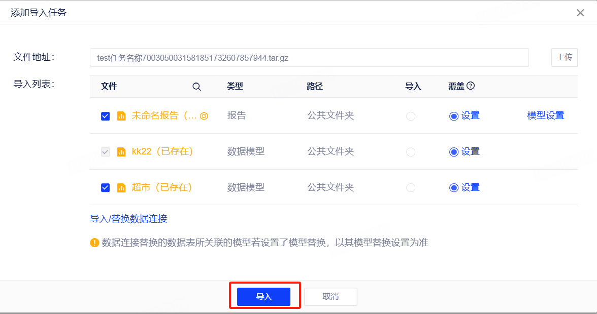 注意:执行导出操作时,会同时导出报告、大屏、数据表格、数据填报所依赖的数据模型跟数据连接。导入时,我们可以选择导入/替换依赖的数据模型跟数据连接。选择替换,则需要指定在新项目中所要连接的数据连接或数据模型。