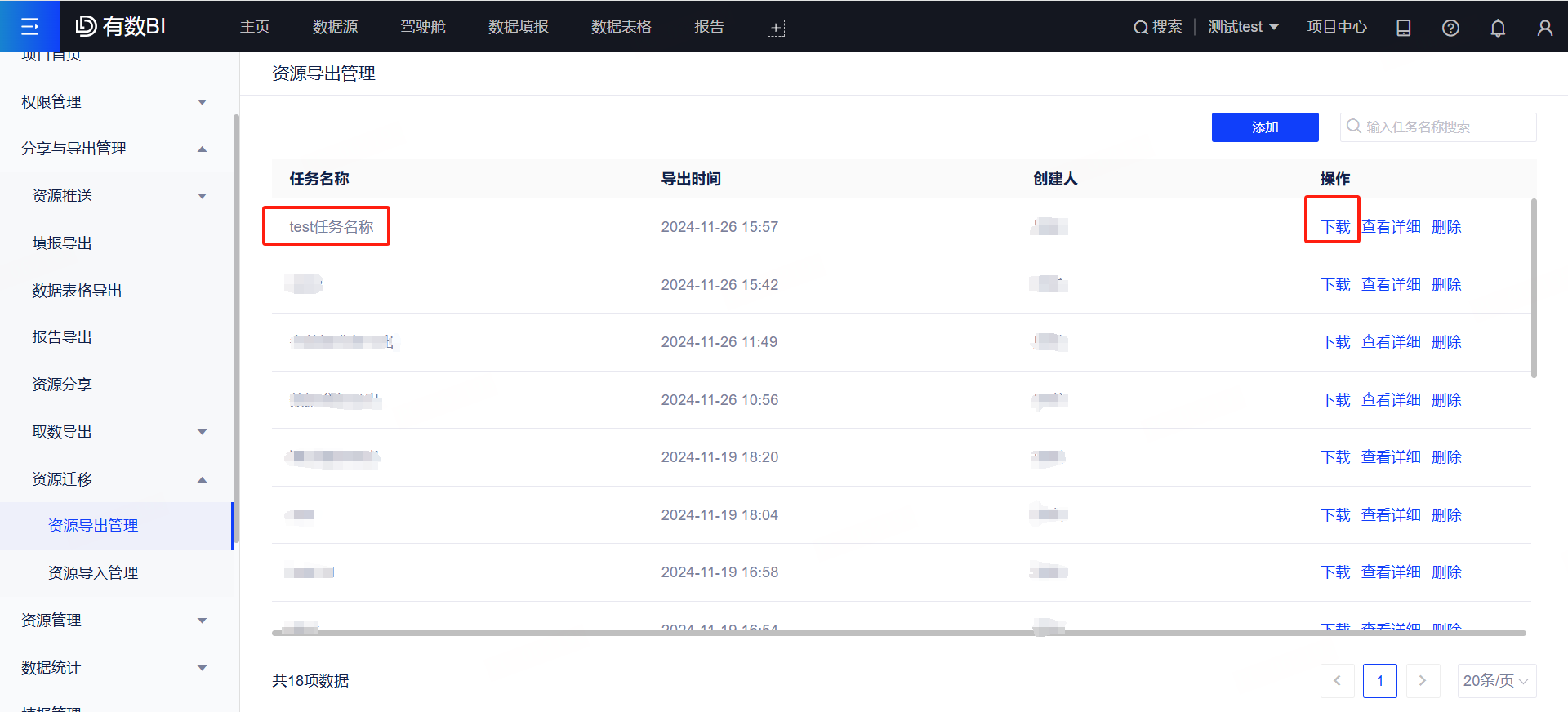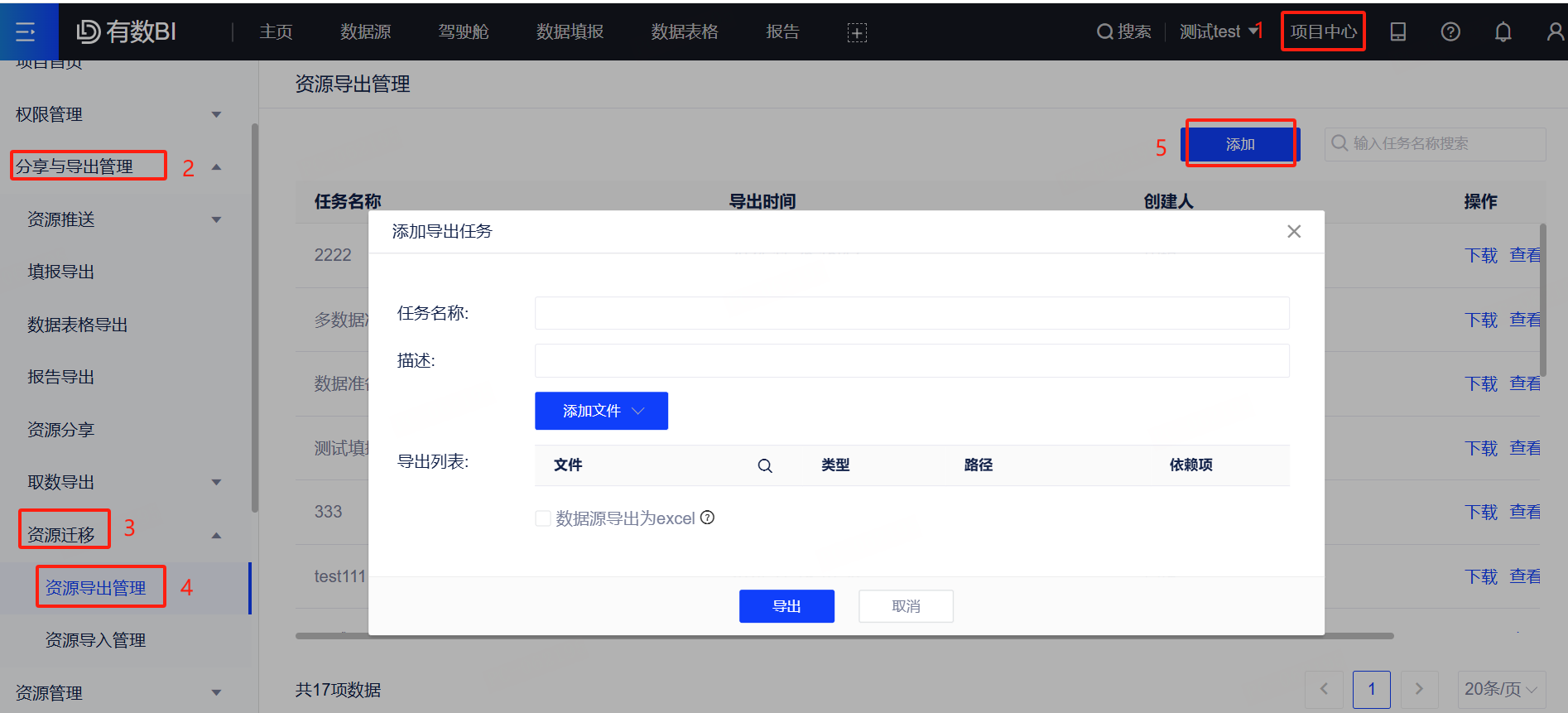 (1)进入项目中心,依次选择[分享与导出管理-资源迁移-资源导出管理-添加],创建一个导出任务;