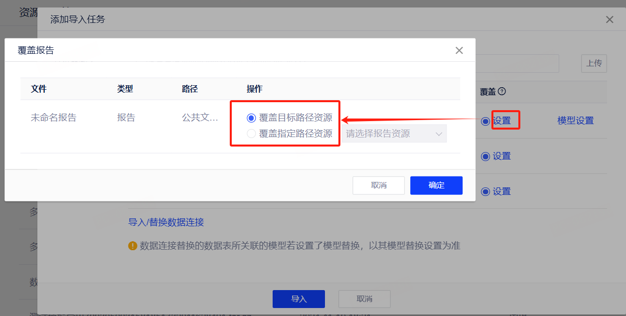覆盖:可选择覆盖已有资源,点击设置可选择覆盖配置。