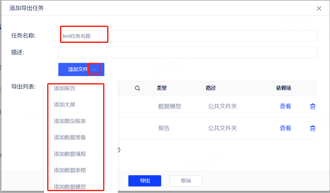 (2)填写任务名称和描述,选择需要导出的资源类型(报告、大屏、数据模型、数据填报、数据表格、复杂报表、数据准备),然后点击“导出”按钮;