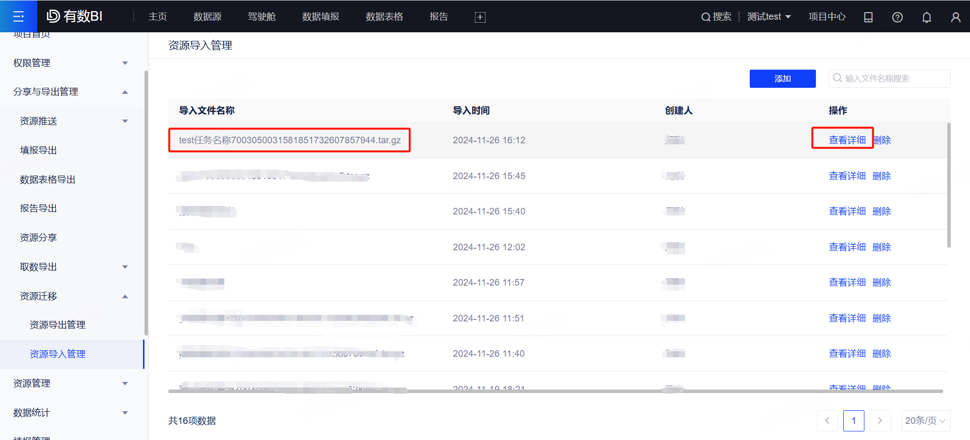 (1)进入目标项目中心,依次选择[分享与导出管理-资源迁移-资源导入管理-添加],创建一个导入任务;