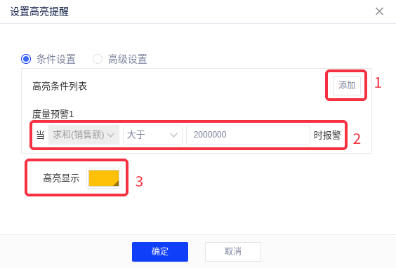 - ①添加高亮条件按钮,可以添加2中的度量预警数量;