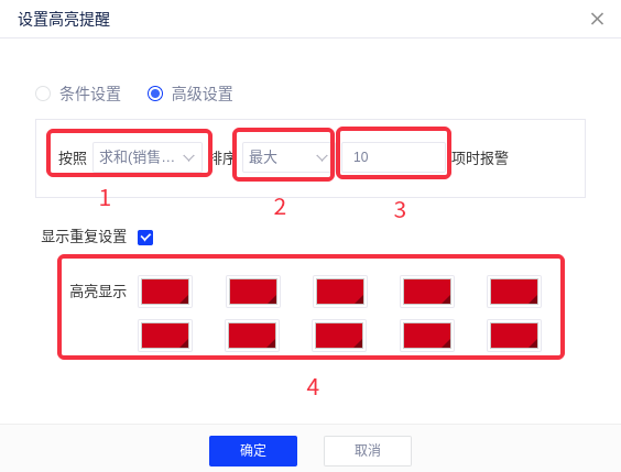 在图表的数据控制面板,点击“设置高亮提醒”按钮进入高亮提醒设置页面,高亮提醒有条件设置和高级设置两种方式。