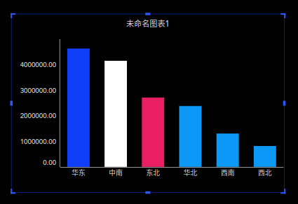 案例:下图以柱状图的地区销售额高亮提醒为例,把销售额地区的前三名做了高亮提醒,其中第一名蓝色、第二名白色、第三名红色。