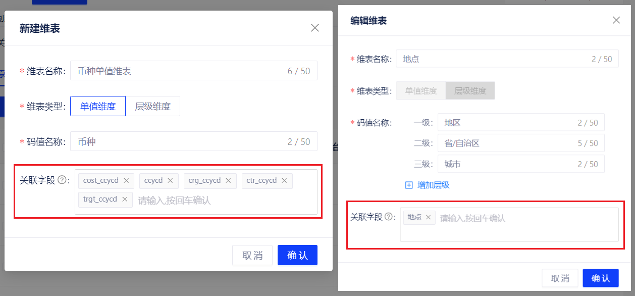 1. 概述2. 快速入门1. 概述用户在新建维表或编辑维表信息时可配置维表关联字段,系统会将所有原名相同的字段绑定到这个维表。表格中用到的字段将会自动关联该维表。如果在连接和模型手动关联字段,将会优先关联。 2. 快速入门(1) 产品入口 在新建维表或编辑维表时在“关联字段”位置手动输入字段名称。 (2) 产品功能 配置后在数据连接数据模型中字段将被关联至维表。 配置后在报表中会将原有的码值替换为对应的内容。