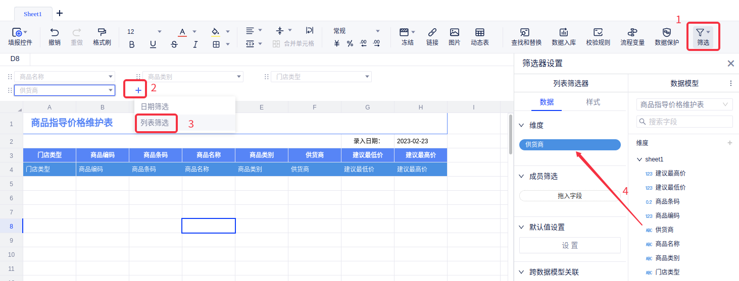 (1)添加列表筛选器控件,如下图步骤所示,依次添加“商品名称”、“商品类别”、“门店类型”、“供货商”等维度字段的筛选器