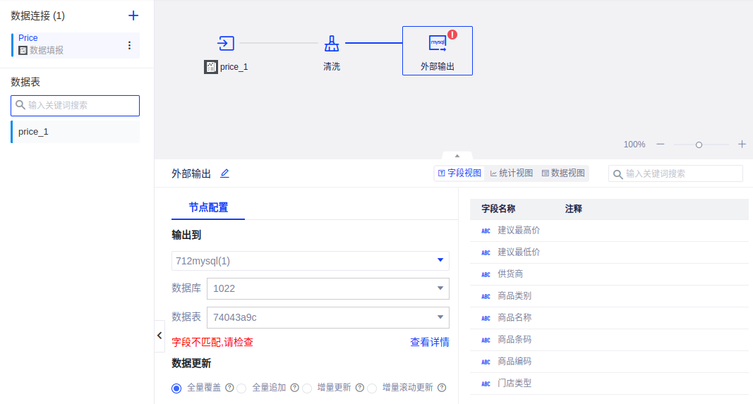 添加外部输出节点,选择原始数据库和相应的表,数据更新方式按需选择。务必保证所有字段都能够对应,否则会出现下图报错