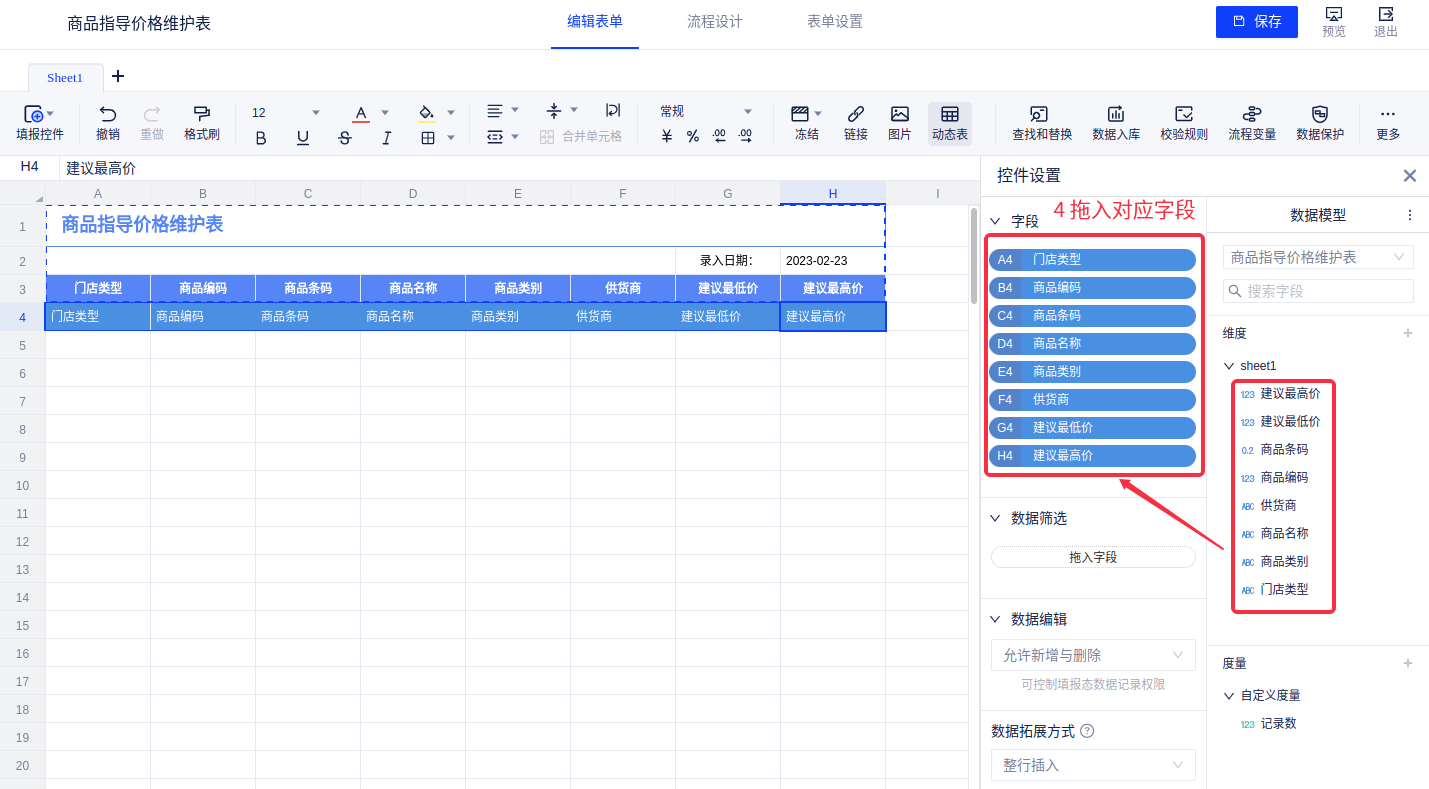 插入动态表,引入事先创建好的数据模型“商品指导价格维护表”