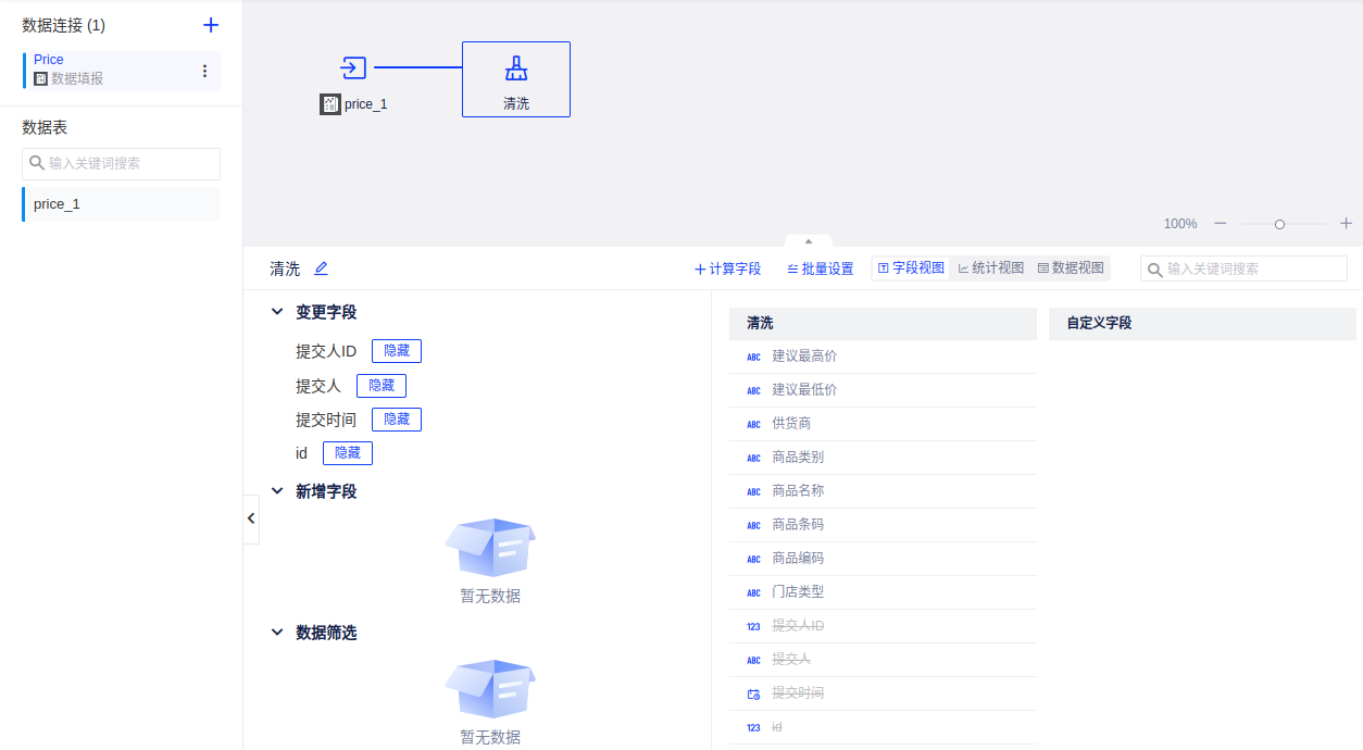 添加一个清洗节点,将提交人ID、提交人、提交时间等字段隐藏,因为原数据库表中没有这些字段,而数据写入需要字段全部匹配,故需要剔除