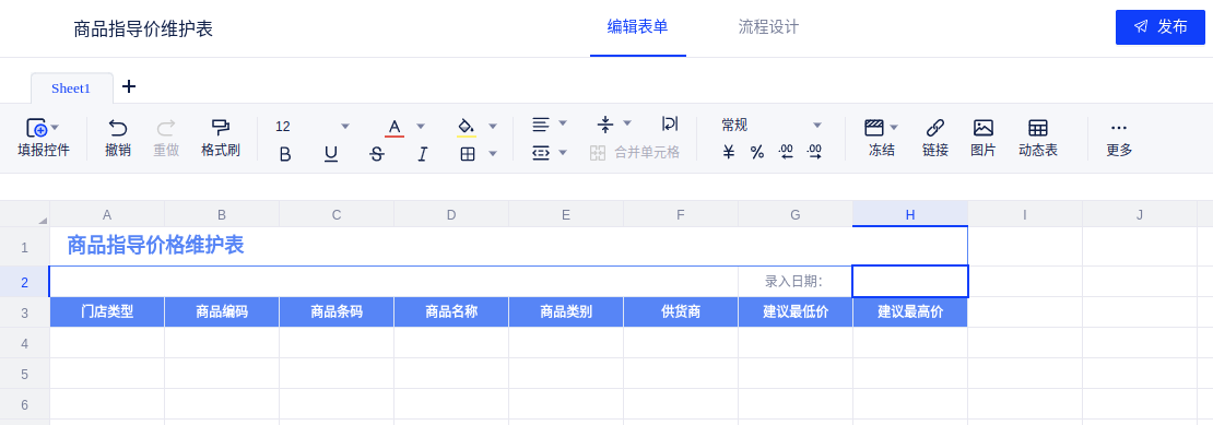 (2)点击右上角发布按钮,回到数据填报首页,可以看到数据库中的商品价格数据已抽取加载,至此表单设计工作结束