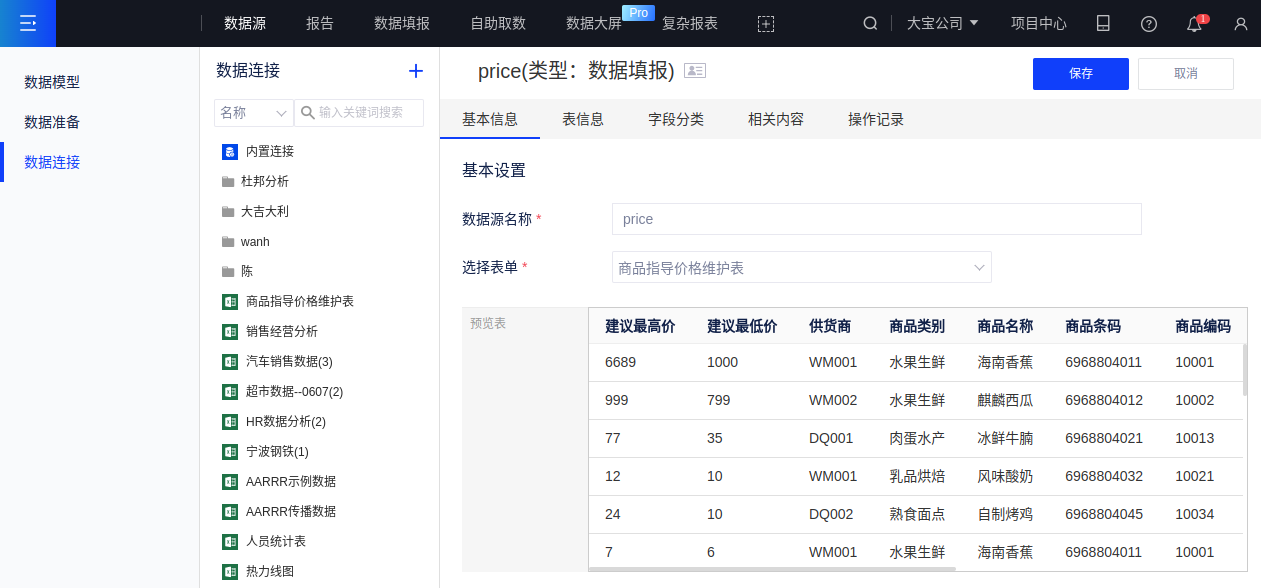 (2)新建一个数据填报类型的数据连接,选择前面已创建的表单