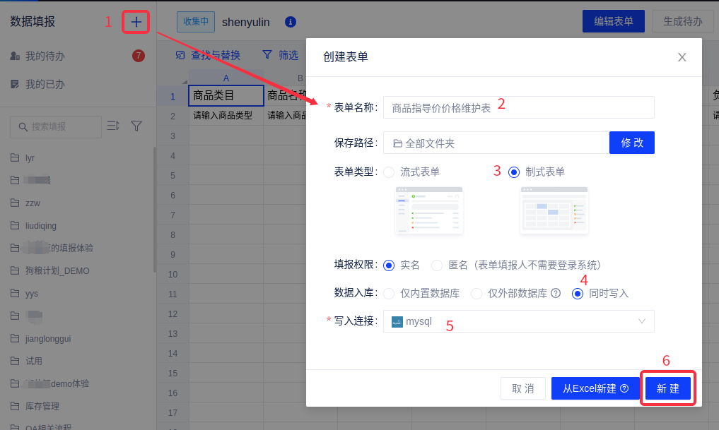 (1)新建一个制式表单,命名为“商品指导价维护表”,数据入库选择“同时写入”(需要事先配置好一个可以写入的mysql数据源)