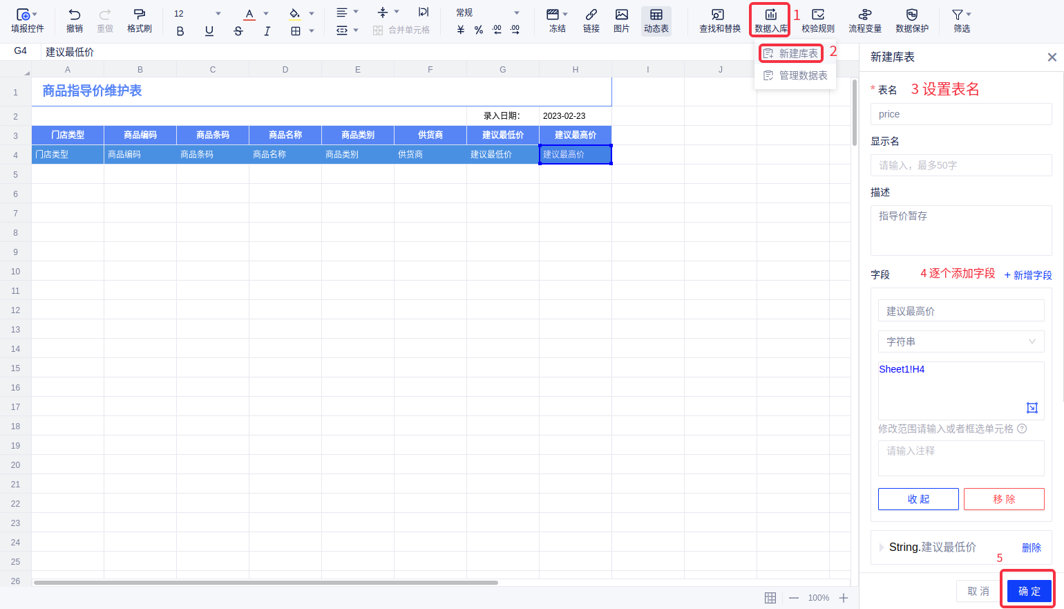 (1)回到表单编辑页面,点击菜单栏的“数据入库”按钮,新建一个名为"price"的表,并将动态表中的字段逐个添加