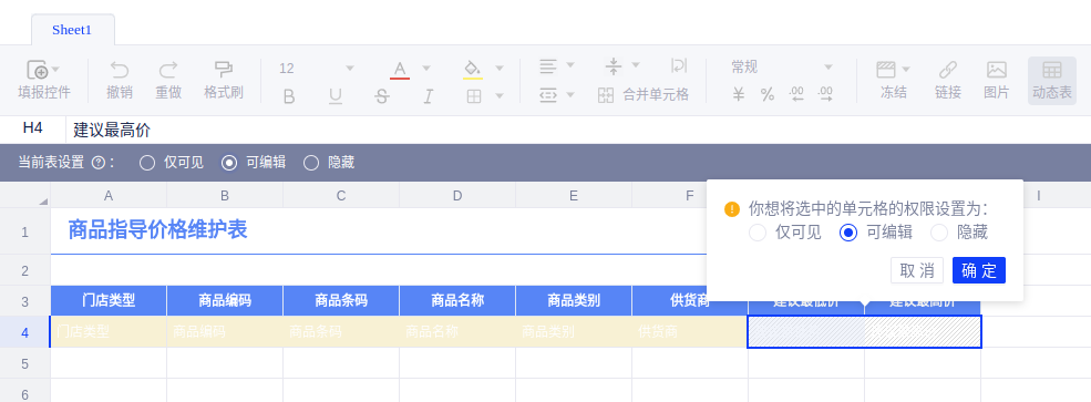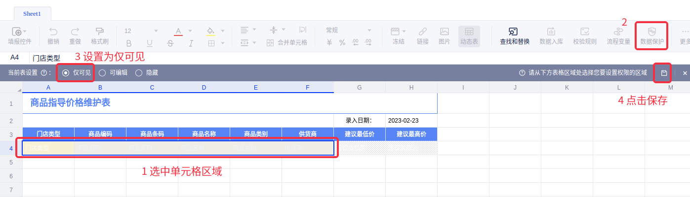设置数据保护,只允许修改“建议最低价”和“建议最高价”字段。