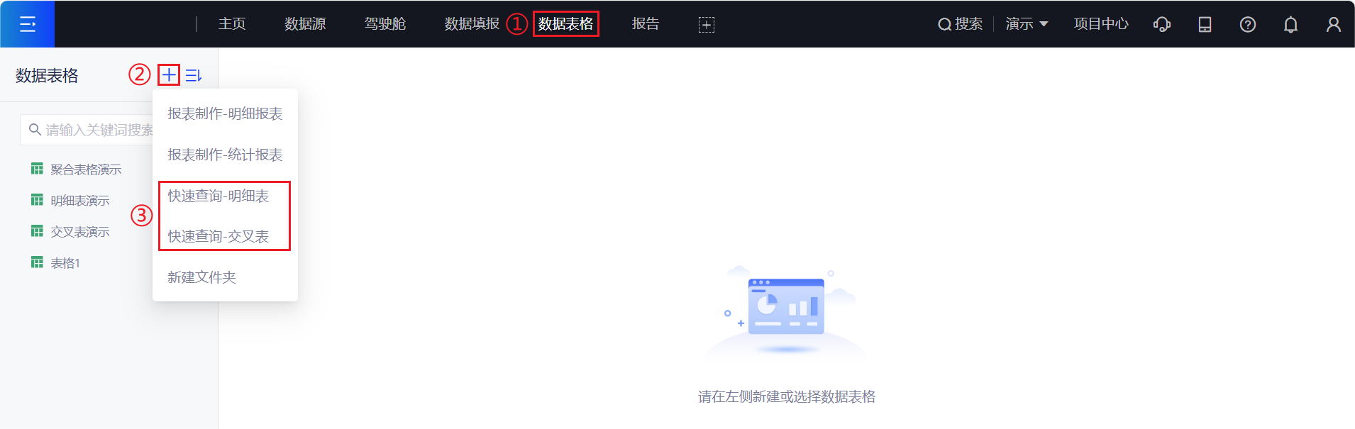 - 新建快速查询:选择需要的报表类型,进入快速查询报表制作模块。