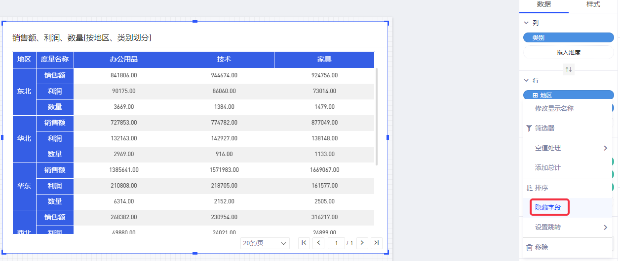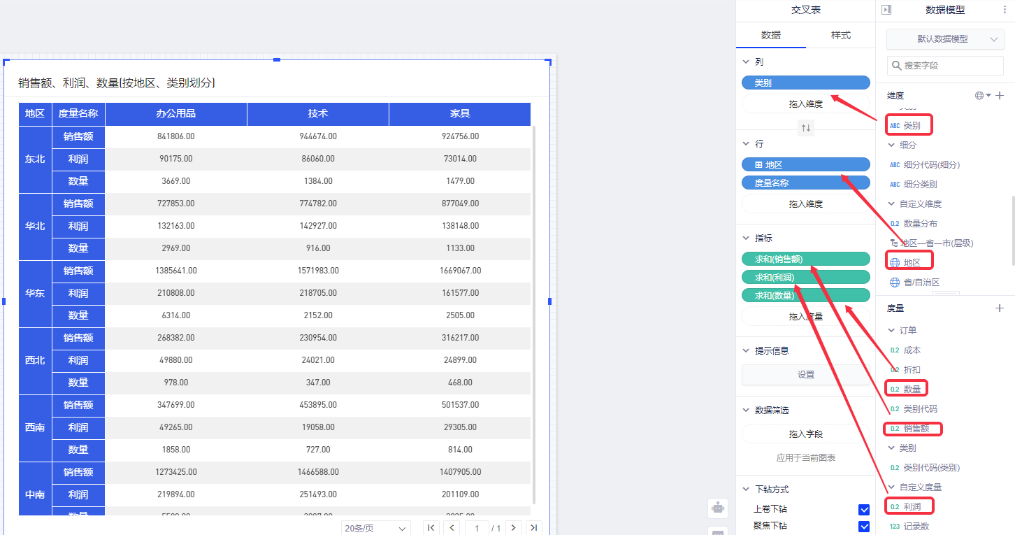 以默认数据模型为例,查看各地区的产品销售额、利润、数量,将涉及到4个字段:维度“类别”、“地区”,度量“销售额”、“利润”、“数量”。