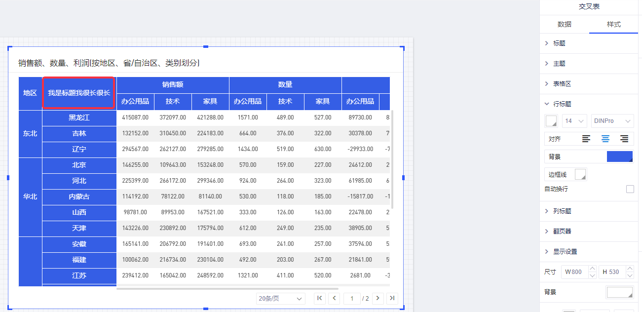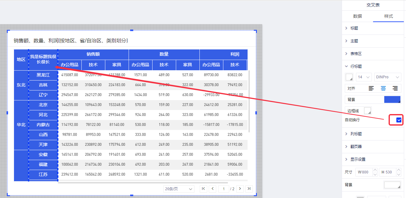 (2)选择【交叉表-样式-行标题/列标题-自动换行】,则当标题过长时会自动换行;