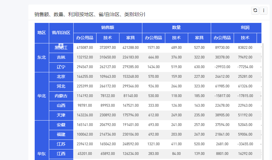 (2)在图表的数据面板的操作:在列中放置“类别”,在行中放置“地区”,然后将“销售额”、“利润”、“数量”拖入到指标,得到初步交叉表;