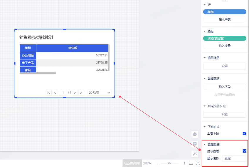 - 若于交叉表中使用螺旋维度,还需根据需求选择直属数据是否展示