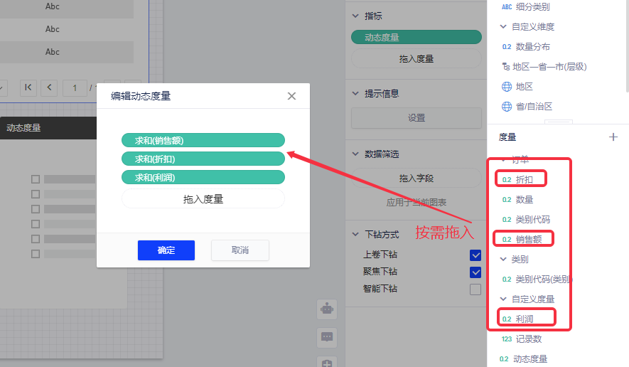 (3)在字段配置区选中“动态度量”,点击下拉菜单(也可右键呼出)后选择[编辑],将需要计算的度量依次拖入弹窗内,然后点击确定;