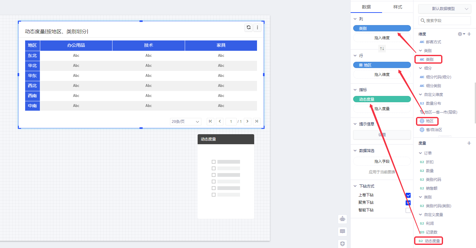 通过动态维度和动态度量,您可在预览或查看模式时可以动态切换维度/度量,展示汇总计算数据。这里以配置动态度量为例,步骤如下:
