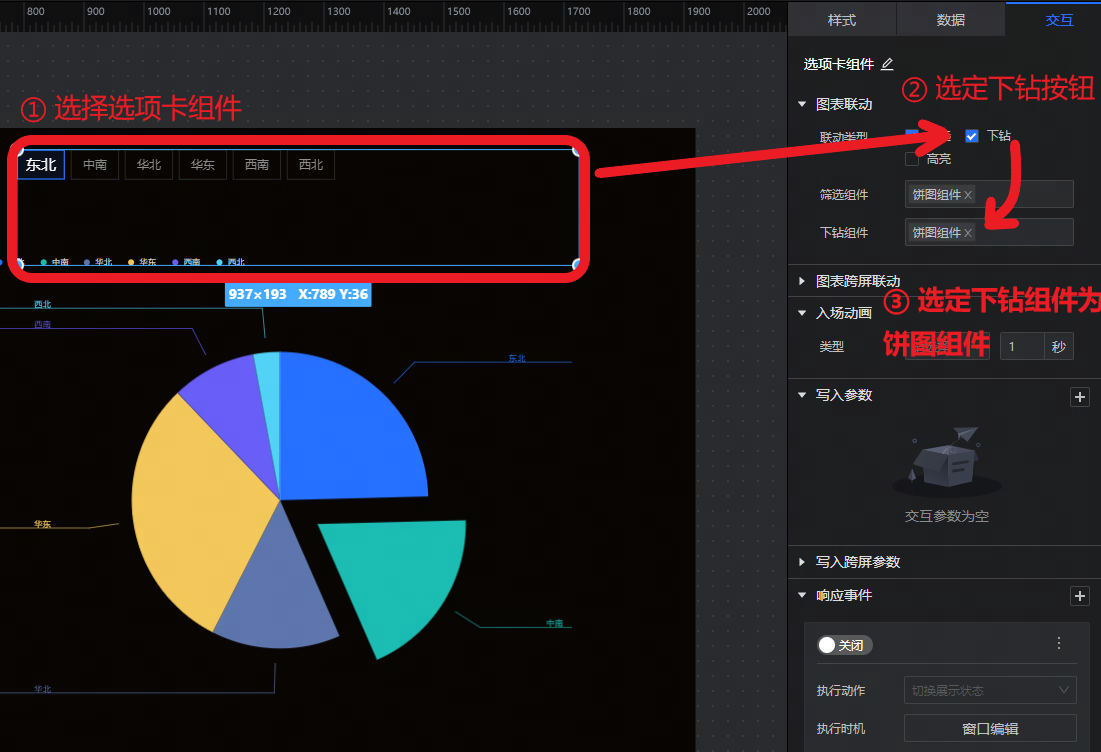 3.点击选项卡,在“交互”Tab下选择筛选,并将筛选组件选定为“饼图组件”。