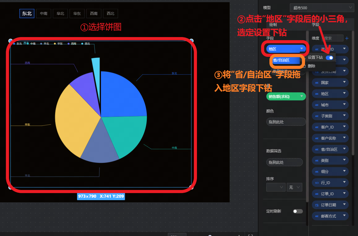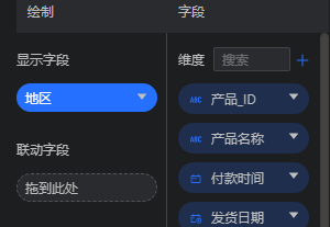 2.让选项卡和饼图组件的显示字段都为“地区”(支持跨模型选择)。