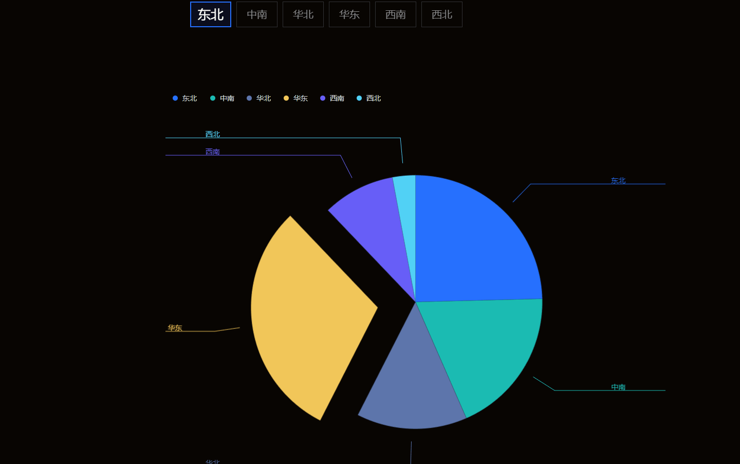6.再次预览大屏,点击选项卡中某一地区,饼图中通下钻的省/自治区的信息便显示出来了,由此一个简单的图表联动就完成了。