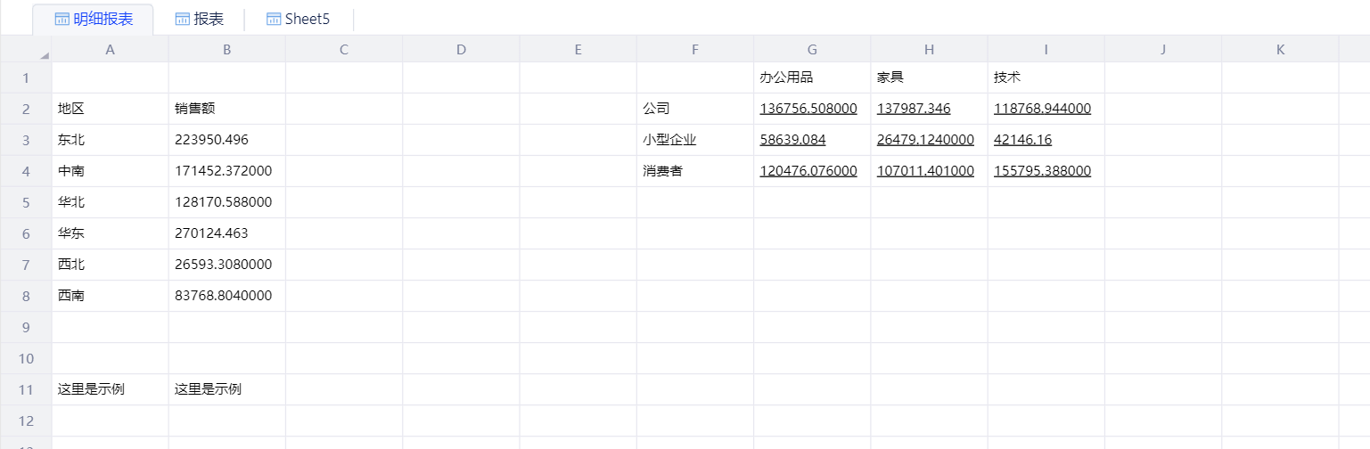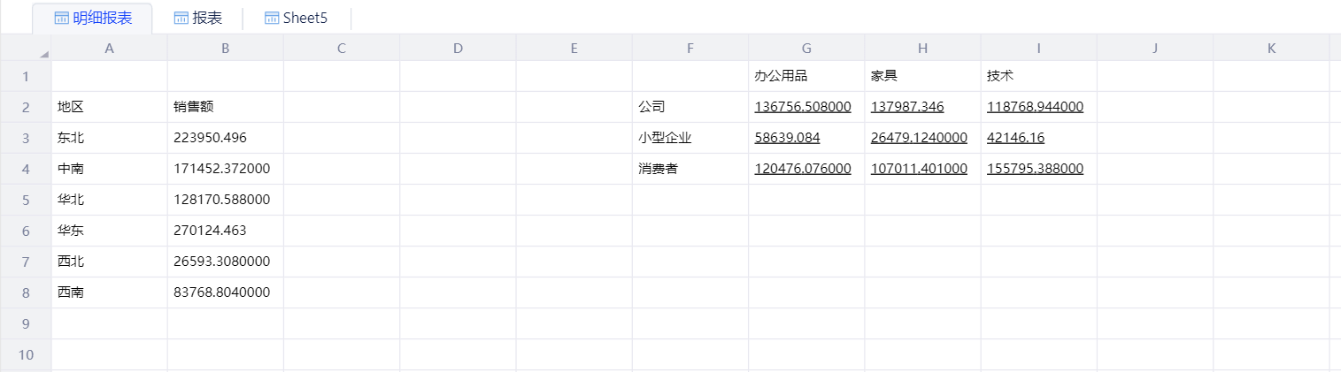 与快速查询-明细表相比,明细报表在同一个sheet页面下,可以区分多个报表区域,且能使用多个数据模型。