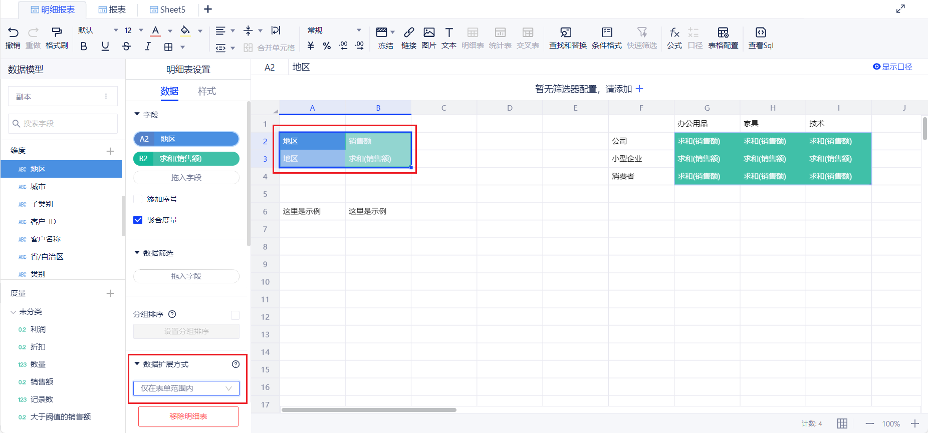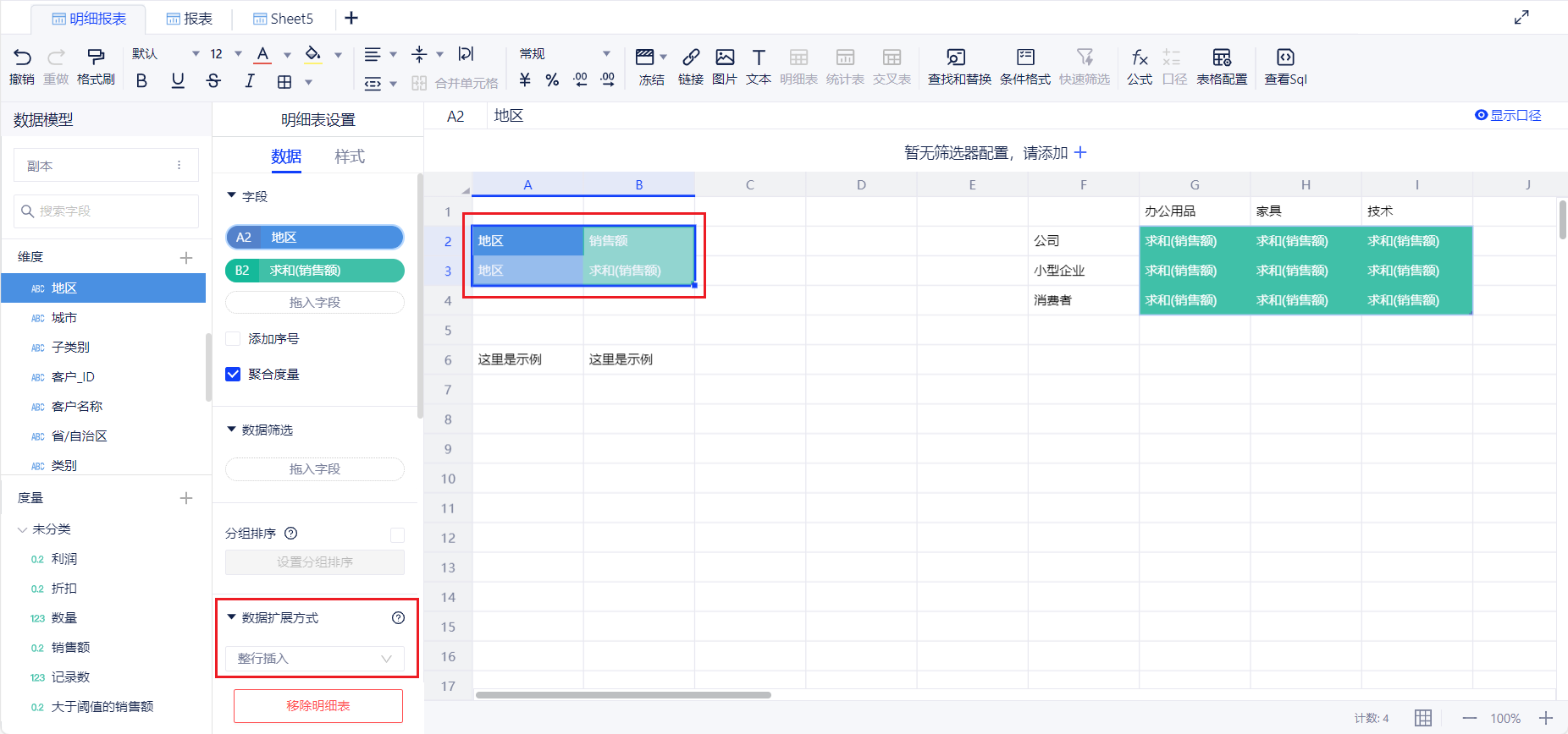 明细表数据拓展方式支持整行插入、仅在表单范围内、直接写入三种方式。交叉表支持整行整列插入。下面以明细表为例,介绍三种插入方式的特点。