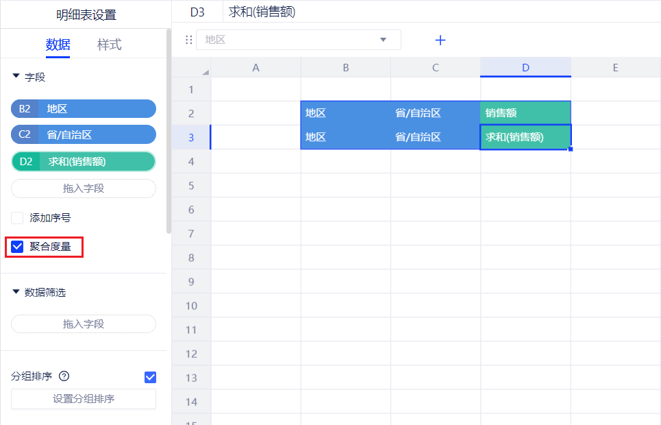 1. 概述2. 快速入门1. 概述根据配置度量字段本身的已设置的聚合方式和已选择的维度做聚合计算。 2. 快速入门(1) 产品入口 明细表配置 --> 字段 --> 聚合度量。 (2) 产品策略 开启聚合度量后,明细表会将度量根据已选择的维度字段进行聚合。