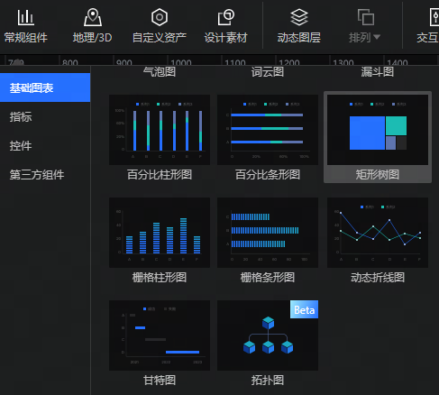 在编辑状态下点击矩形树图组件即可对其进行配置,配置内容分为样式、数据和交互三个Tab。(本节仅介绍矩形树图特有属性的配置,基础图表共性的配置请参考下文“组件配置”)