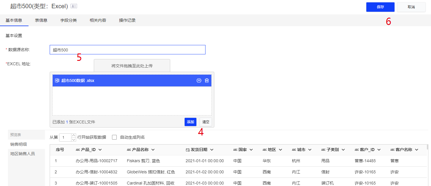 在[数据源]模块,基于上一步建立的[数据连接]来创建数据模型,将需要的多张数据表进行关联,并可以进行一些数据处理操作(比如重命名字段、空值过滤、添加自定义字段等等),示例如图所示(这里只做简单的内部关联)。