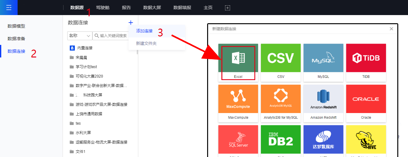 依次点击进入[数据源>数据连接>添加连接],选择需要连接的数据源类型(Excel、CSV、MySQL等)与数据建立连接。示例如图所示(这里添加的是Excel)。