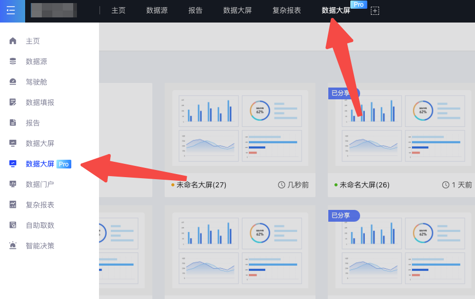 在上方或者左侧的导航栏中,进入“数据大屏Pro”模块。