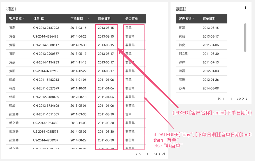 它的意思是以“客户名称”的粒度来计算最小的下单日期,也就是每个客户首单的日期,然后我们可以通过比较来给每个订单打标签啦。(我们的测试数据里,每个用户每天至多下一单,这样只要两个日期是同一天,就判定为首单,如果一天多单则还需要比较两个日期的时分秒是否一致)