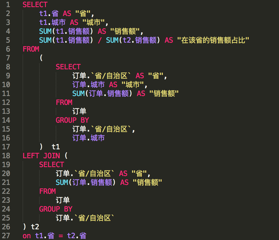 这时候我们可能需要用SQL去取两个不同粒度视图的数据,然后放在一个视图里进行分析,SQL语句如下所示,如果不了解SQL可以忽略,不影响理解跨视图粒度计算