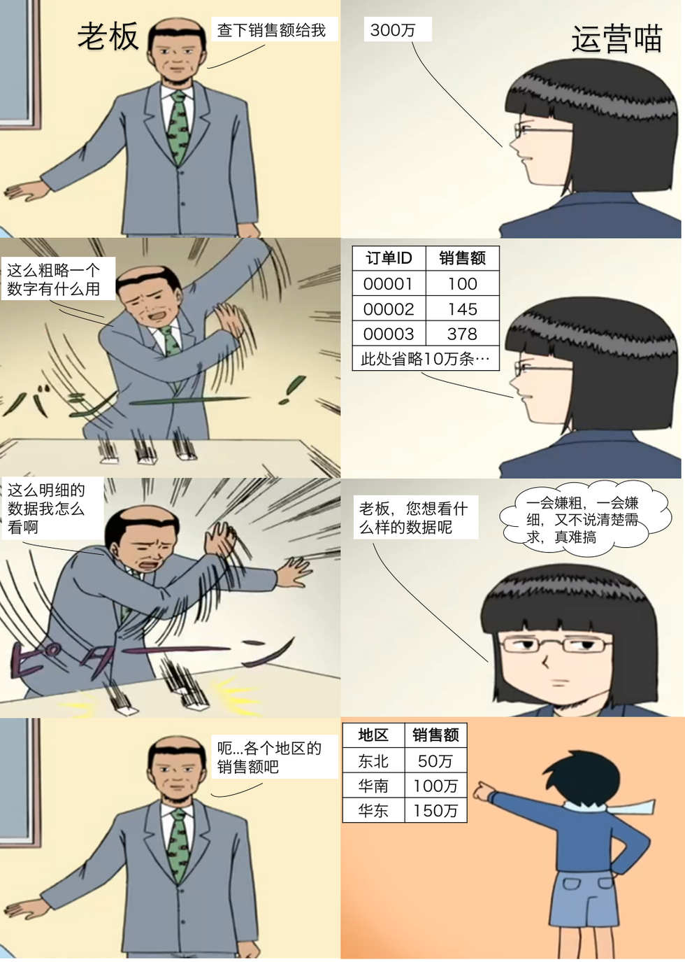 漫画中,老板的“粗略”、“明细”描述的就是数据的粒度,越明细的数据包含的信息越多,同时也越难解读,所以一般根据需求不同会挑选不同粒度的数据来分析。