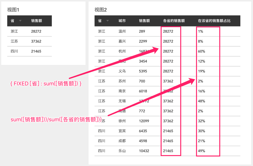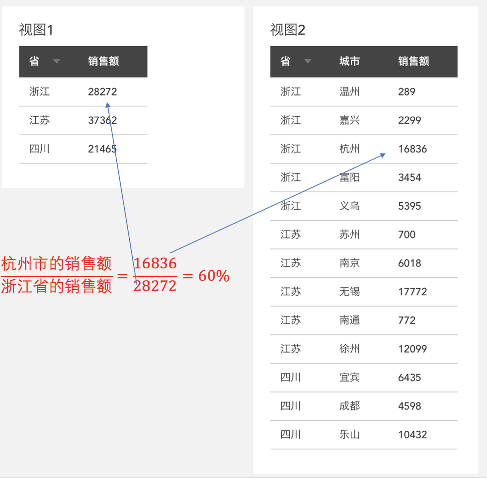 例1:还是上文的视图1跟视图2,当我们需要在视图2里加一列数据,显示每个城市销售额在该省的占比,比如计算杭州的销售额占浙江省的比例,这时候我们需要“杭州的销售额/浙江的销售额”,但杭州的销售额数据在视图2里,而浙江的销售额数据在视图1里。没法拿到一起计算: