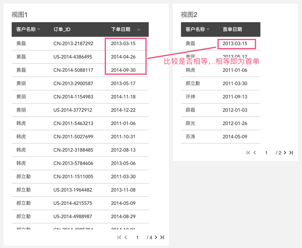 得到每个客户的首单日期后,我们只要把每个订单的日期去跟首单日期比较,如果相等就是首单,但现在遇到了难题,要比较的两个数据来自不同粒度的视图: